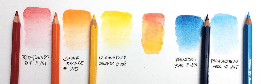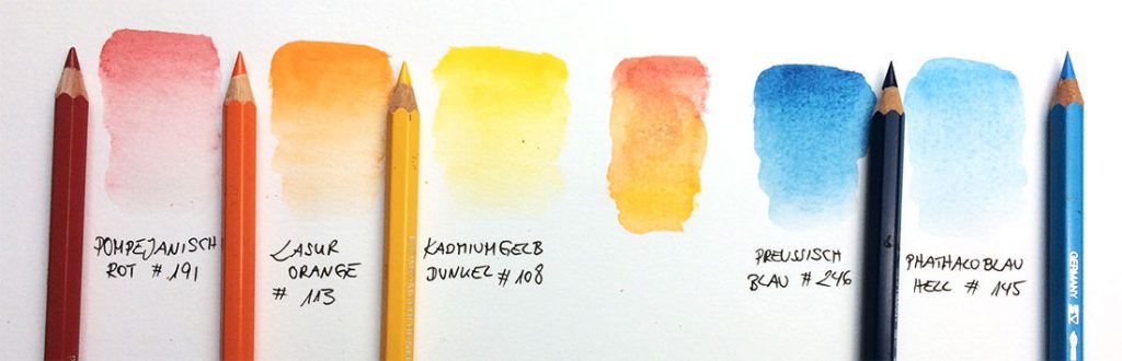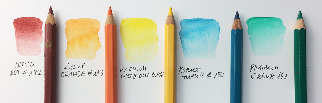 Ich benutze die Albrecht Dürer Aquarellstifte von Faber Castell,  die eine sehr gut Qualität und Lichtbeständingkeit haben. Ausserdem ist Faber Castell ein Unternehmen, dass sie aktiv gegen Kinderarbeit einsetzt und grossen Wert auf Nachhaltigkeit setzt. Außerdem sind die Faber Castell Produkte sehr gut hier im Handel zu erhalten, selbst kleiner Kreativ-und Hobbyläden führen diese Stifte häufig.