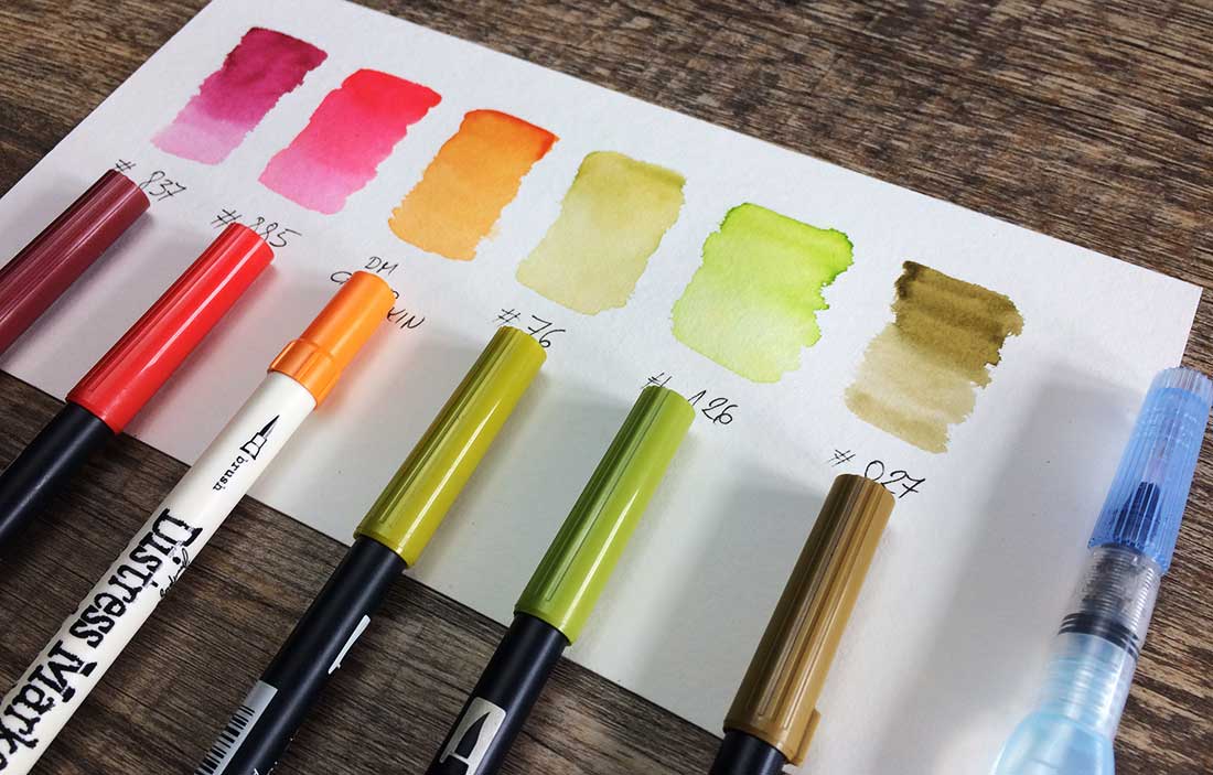 Wie auch bei dem Kolorieren mit den Aquarellstiften empfehle ich dir vorher ein paar Farbproben auf eine Aquarellpapier zu bringen. Gerade die Brush Pens sehen oft auf Papier anders aus als die Stiftkappe und mit dem aktivieren von Wasser ändert sich die Farbe nochmals ein wenig.