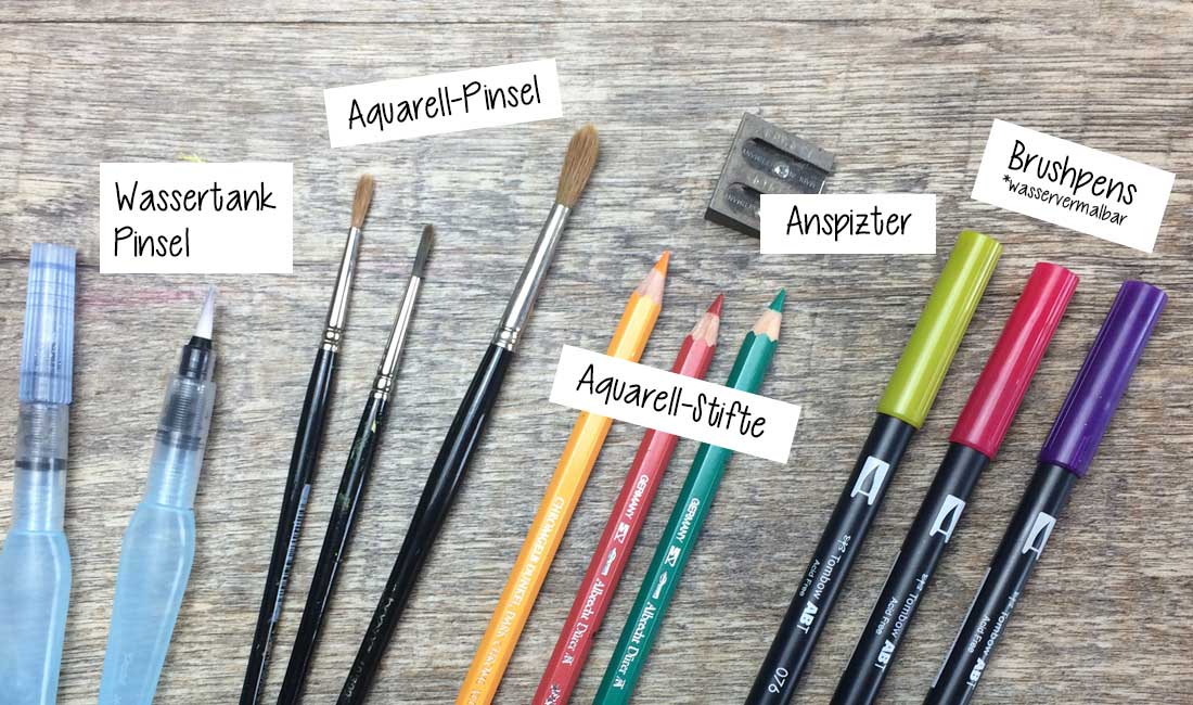 Ich benutze in diesem Kurs einen herkömmlichen Pinsel für Wasserfarben und auch einen Wassertank-Pinsel. Beide Techniken des Kolorierens können auch mit einem Pinsel, also entweder Wassertank- oder dem Aquarellpinsel durchgeführt werden.