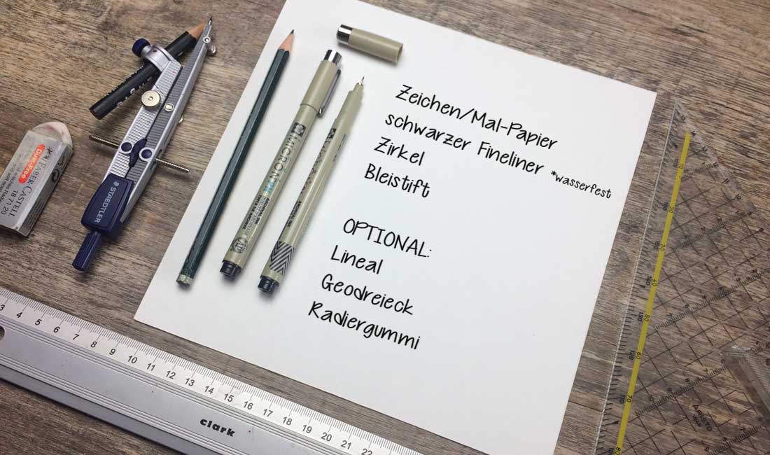 Für das Kreieren von Mandalas bedarf es nur eine kleine handvoll an Materialen. Die Minimum-Ausstattung für das Zeichnen von Mandalas auf Papier ist ein Blatt Papier und ein Stift.