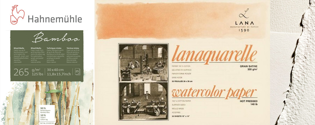 Ich empfehle dir ein Papier zu benutzen, dass du später auch noch mit Wasserfarben kolorieren kannst. Also ein dickeres Papier mit einer Grammatur von mindestens 260 g. Am besten eignet sich ein Aquarellpapier oder ein Mixed Media Papier. Ich benutze gerne das Bamboo Mixed Media Papier von Hahnemühlen, das eine schöne leicht strukturierte Oberfläche hat oder ein heiss gepresstes (hot pressed) Aquarellpapier, wie zum Beispiel das LANA Lanaquarelle . Heiss gepresstes Aquarellpapier wird beim Herstellungsprozess durch eine erwärmte Rollpresse geführt und hat dadurch kaum Oberflächenstruktur und ist glatter, viele Hersteller bezeichnen diese Art Papier auch als Feinkorn.