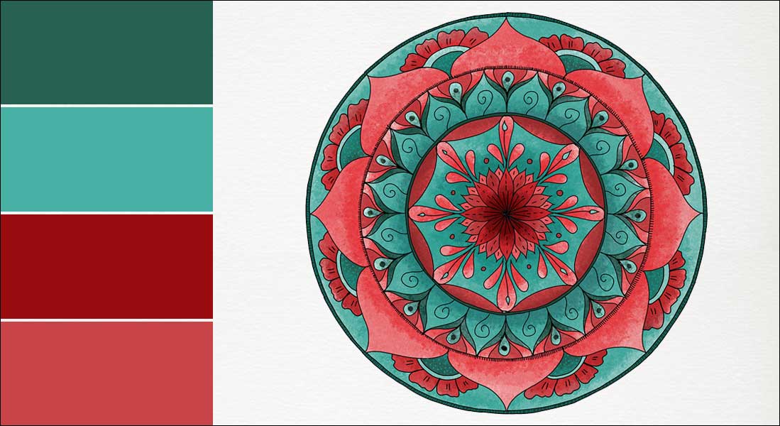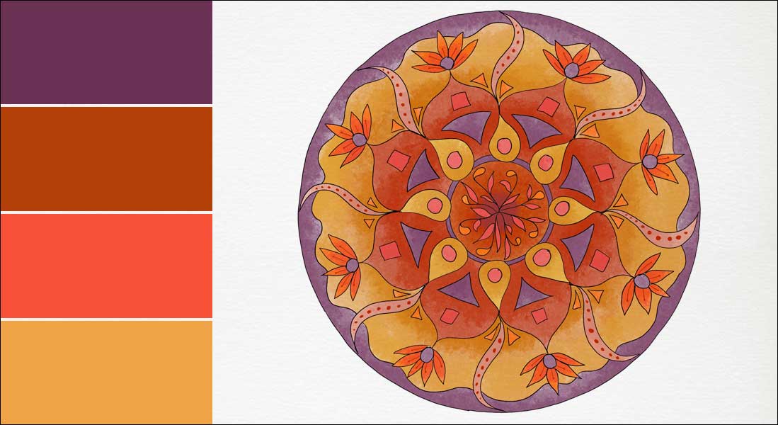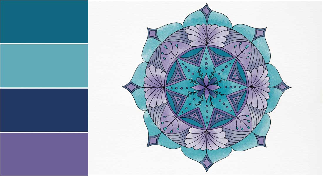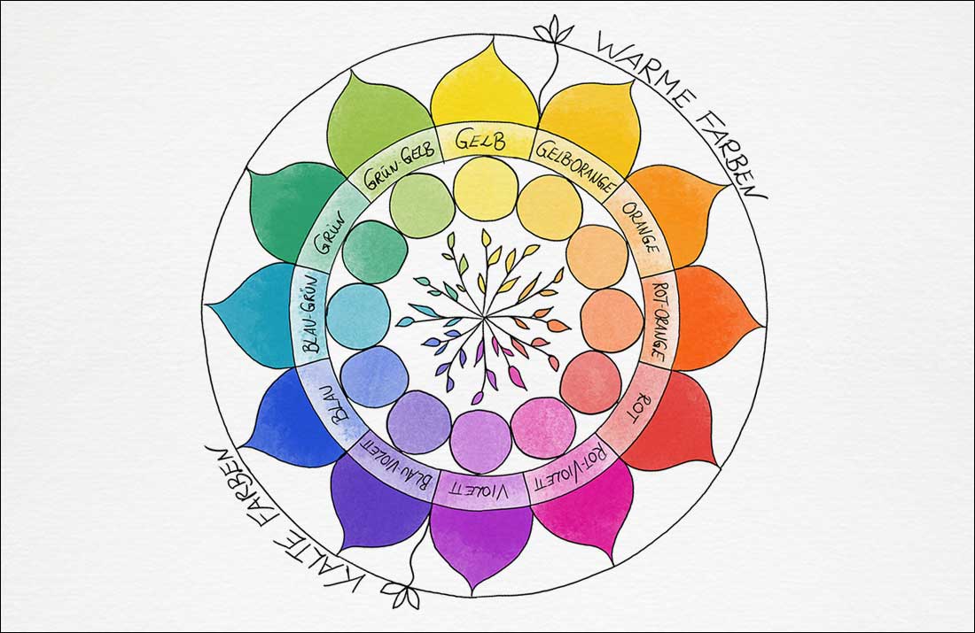Kalte und warme Farben kann man in der Mitte des Farbkreises trennen. Der Bereich der warmen Farben sind die Farben mit den gelben und roten Farbnuancen. Der kalte Farbbereich beinhaltet die Blau- und bläulichen Grüntöne, die als kalt empfunden werden. Eine Farbharmonie lässt sich erzeugen, indem du dein Mandala nur mit warmen oder aber auch nur mit kalten Farben kolorierst.
