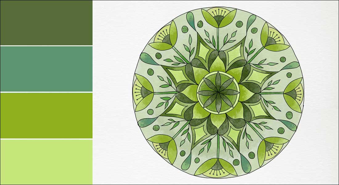 Das monochromatische Farbschema umfasst verschiedene Farbtöne aus der gleichen Farbfamilie, wie zum Beispiel Grüntöne.